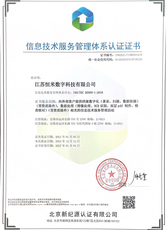 信息技术服务管理体系认证证书