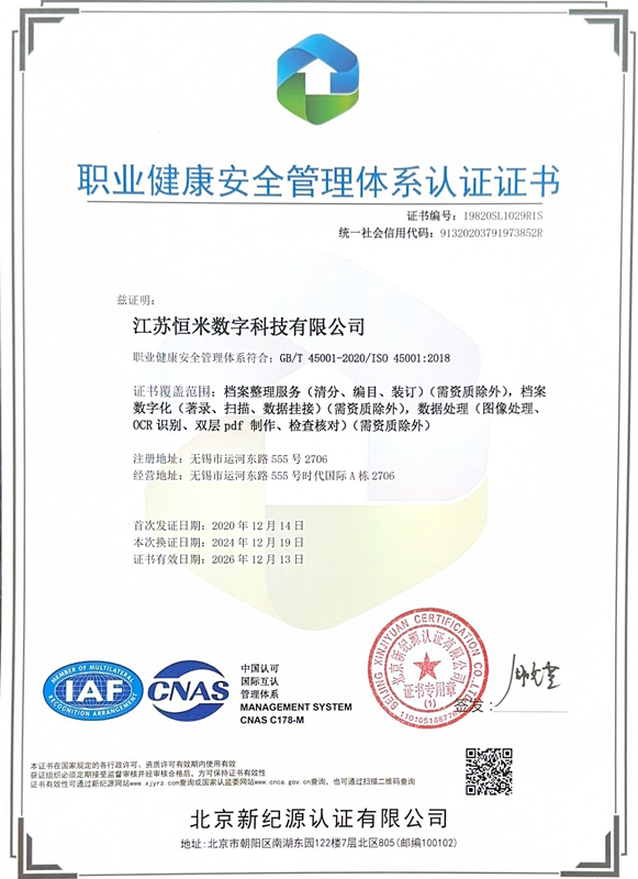 职业健康安全管理体系认证证书